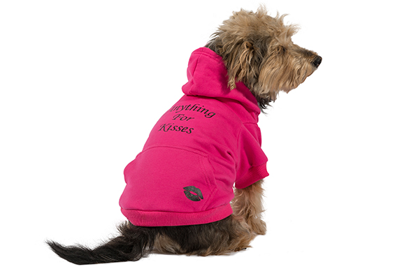 With ‘Anything for kisses’, a kiss on the pocket, and a bright pink bone this hoodie is ideal for loving and loveable dogs, keeping them toasty while letting others know about their sweet-hearted nature.